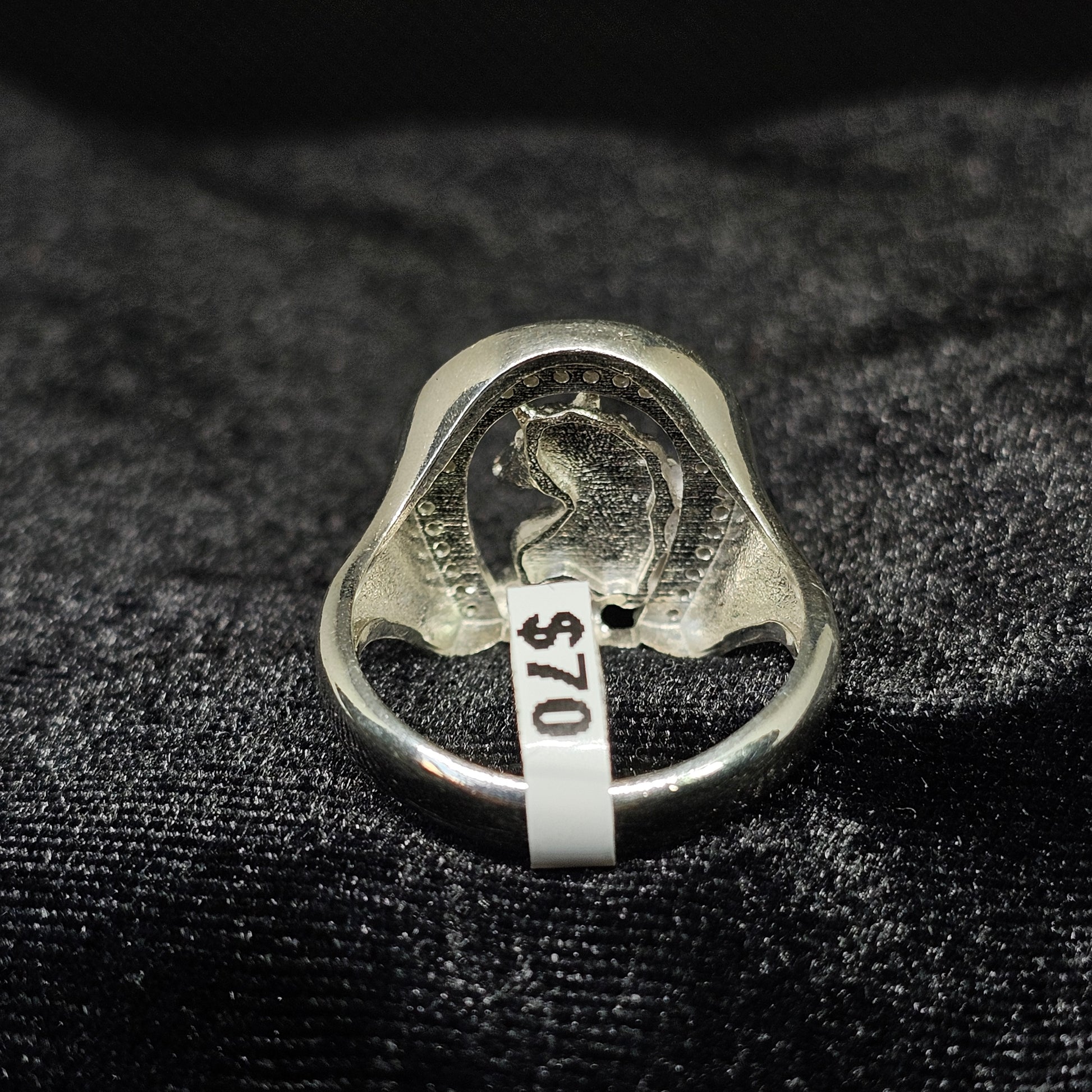 This men's sterling silver ring combines rugged style with refined detail. A horseshoe outline is adorned with cubic zirconia accents that catch the light beautifully, while an intricate silver horse design graces the interior band. An ideal choice for those seeking meaningful Western-inspired jewelry with lasting quality and sophisticated craftsmanship.